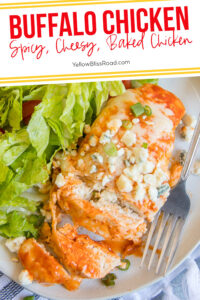 Esta receita de Frango Búfalo Assado com Queijo é tenra e suculenta, com um grande pontapé de calor que é arrefecido por queijos cremosos e derretidos. É uma receita de frango assado fácil, de 3 ingredientes, deliciosa e cheia de sabor, e combina bem com lados simples como One Pan Cauliflower Mac and Cheese, 5-Minute Parmesan Ranch Broccoli e Cheesy Garlic Bread.